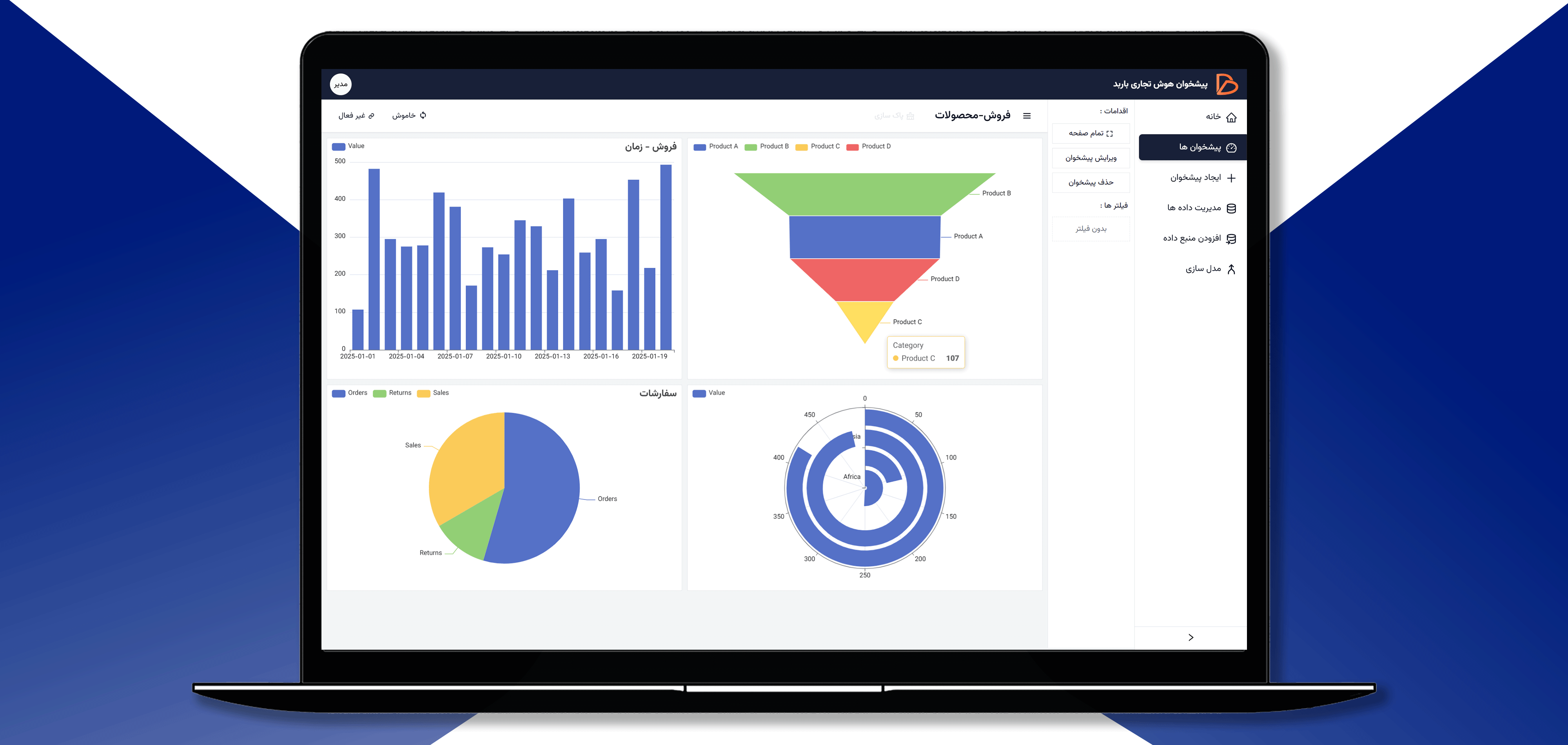 با استفاده از نمودارهای پویا، فیلترهای هوشمند و ویجتهای قابل تنظیم، گزارشهایی زنده و بصری بسازید که در لحظه بهروزرسانی میشوند